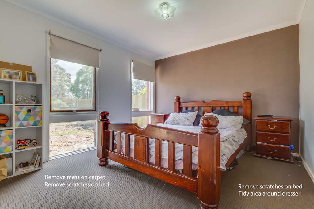 TODO LIST: Clean up carpet, remove scratches on bed, remove junk under bed and tidy up dresser.